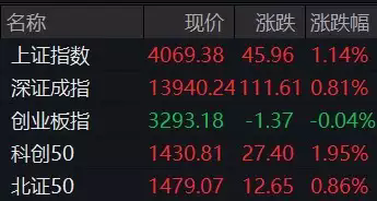 截至午間收盤,滬指漲1.14%,報4069.38點,創(chuàng)逾10年新高;深成指漲0.81%,報13940.24點,創(chuàng)業(yè)板指跌0.04%,報3293.18點,科創(chuàng)50指數(shù)漲1.95%,