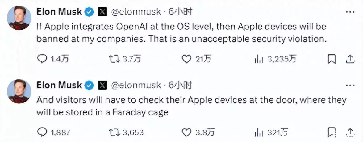 在批判OpenAI這件事上,馬斯克總是沖在第一線,孜孜矻矻營業(yè),不遺余力地揭示OpenAI在迷失本心、AGI安全治理、信息泄露等方面的諸多問題。馬斯克與蘋果之間的糾葛似乎由來已久。
