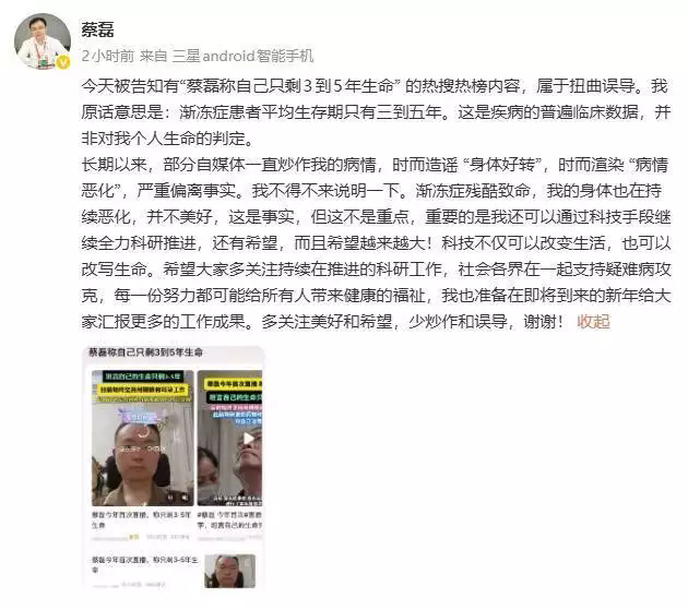 11月26日,京東集團(tuán)原副總裁、漸凍癥患者蔡磊發(fā)文回應(yīng)“只剩3到5年生命”風(fēng)聞。 蔡磊表明,