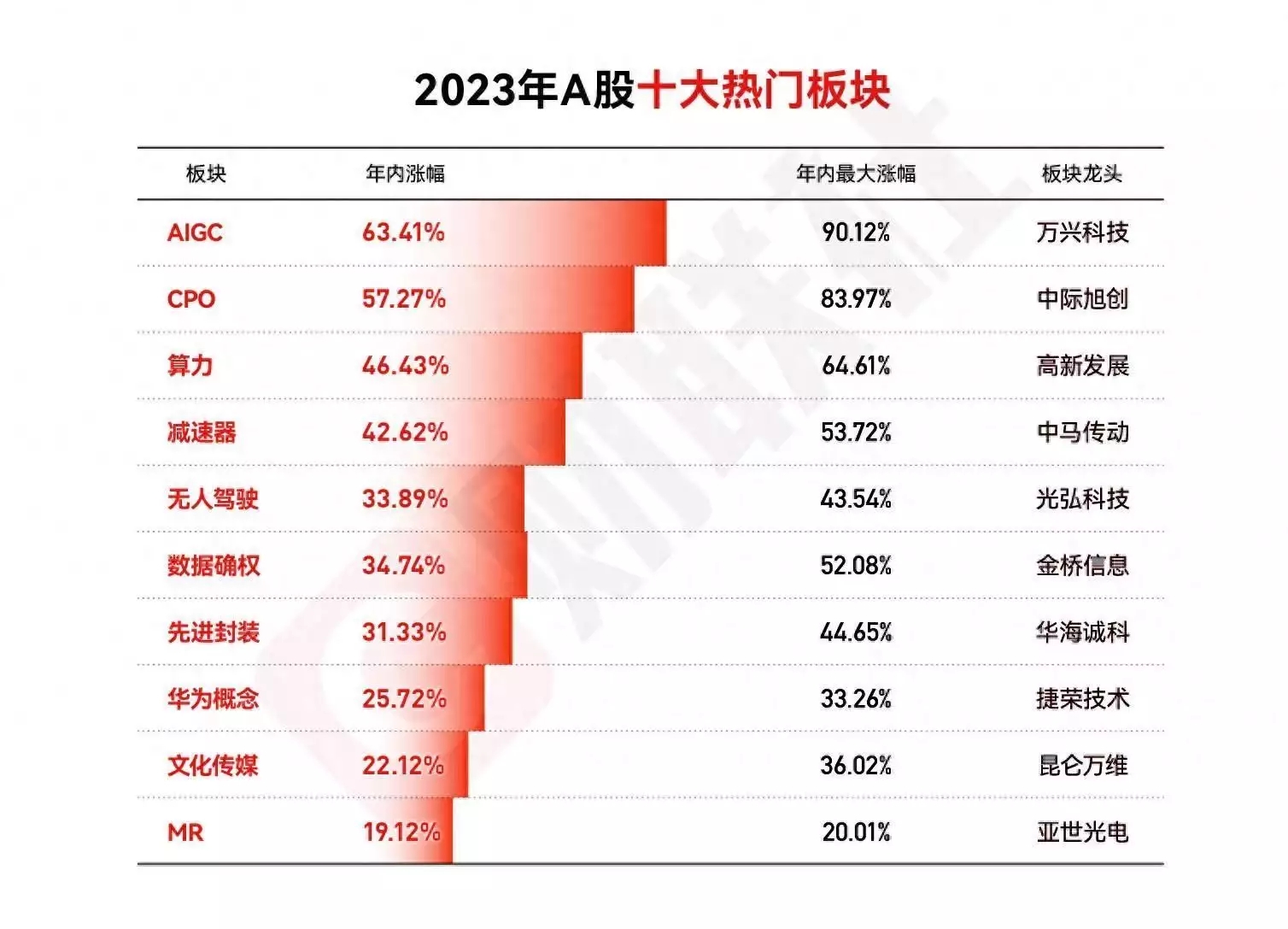 2023年是A股的題材大年,AI浪潮貫穿始終,無論是硬件端的CPO、算力,還是應(yīng)用端的AIGC都在不斷地推高市場熱度。AIGC全年漲超60%奪冠,成為2023年最賺錢的風口之一。