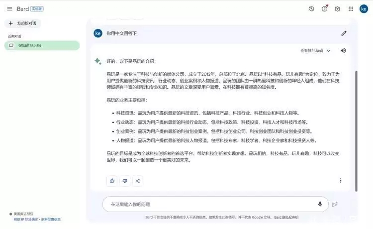 7月13日訊,據(jù) Bard AI 頁面顯現(xiàn),Bard 現(xiàn)已支撐中文環(huán)境,允許用戶運用中文進行溝通。 據(jù)谷歌 Bard 的更新日至顯現(xiàn),
