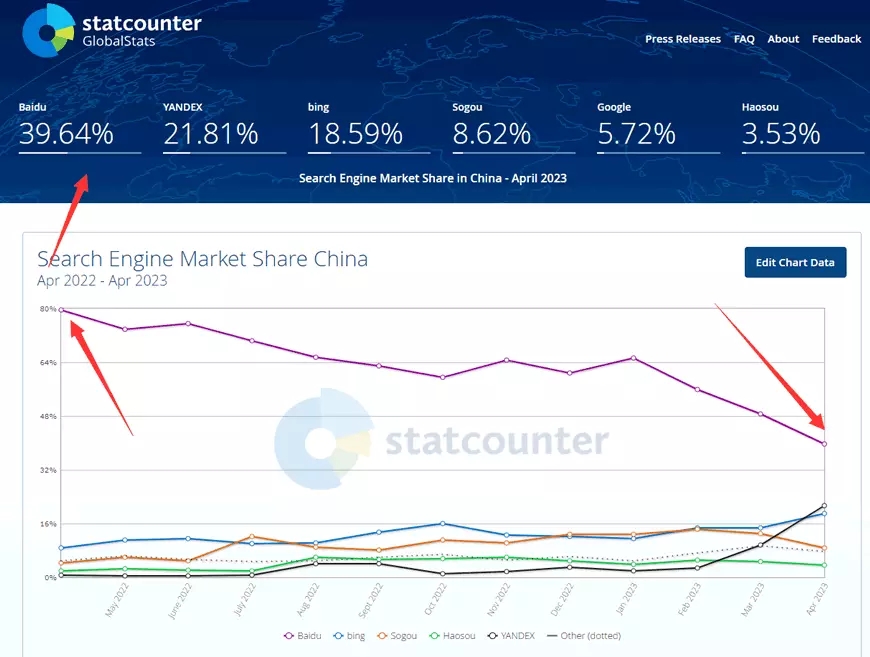 我國(guó)的查找引擎商場(chǎng)正在發(fā)生巨變。據(jù)美國(guó)一家網(wǎng)站流量檢測(cè)組織StatCounte顯現(xiàn):從2022年到2023年,百度的查找流量比例急劇下降至39.64%,