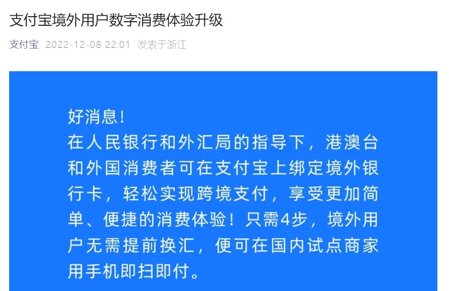 12 月 8 日消息,支付寶今天宣布,在人民銀行和外匯局的指導下,港澳臺和外國消費者可在支付寶上綁定境外銀行卡,輕松完成跨境付出。