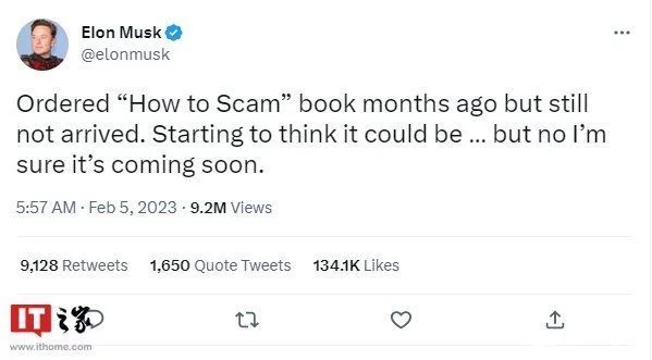 馬斯克發(fā)今日推文稱:“在幾個月前訂購了一本叫做《怎么欺詐》的書,但還沒到,開始覺得它可能是... 不,我相信它很快就會到了。”