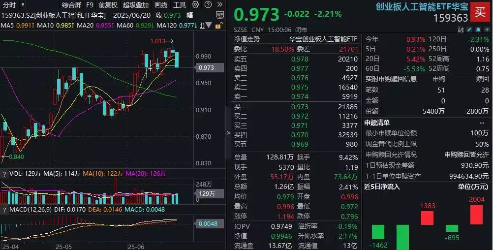 一、周五(6月20日),A股縮量震蕩,科技股全線走低。AI應用領(lǐng)跌原因:短期遇冷與結(jié)構(gòu)性挑戰(zhàn) 市場表現(xiàn) 創(chuàng)業(yè)板人工智能ETF(159363):