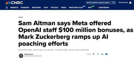 6 月 21 日消息,OpenAI 首席執(zhí)行官薩姆・奧爾特曼(Sam Altman)周三表示,Meta 曾向某 OpenAI 員工開出 1 億美元(現(xiàn)匯率約合 7.18 億元人民幣)獎金來挖人,但未能成功。事件核心解讀