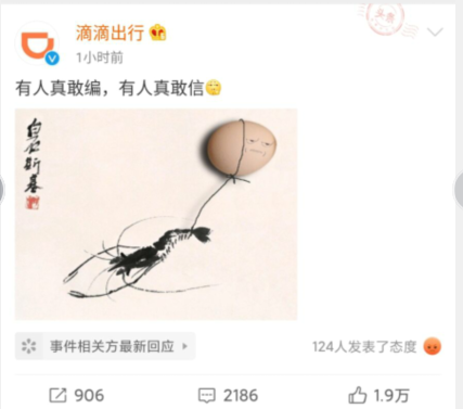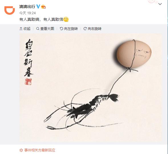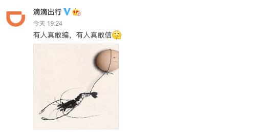 6月11日晚間,@滴滴出行 官方微博發(fā)布了一則很奇怪的微博,文字稱“有人真敢編,有人真敢信”,并且配上了一個(gè)摳鼻的表情,和一張“蝦扯蛋”的圖片。