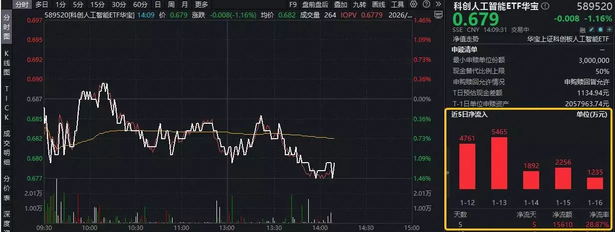 今日(1月19日)要點(diǎn)布局國(guó)產(chǎn)AI工業(yè)鏈的科創(chuàng)人工智能ETF華寶隨市盤(pán)整回調(diào),場(chǎng)內(nèi)價(jià)格現(xiàn)跌1.16%,數(shù)據(jù)顯示,該ETF此前5日連續(xù)吸金,