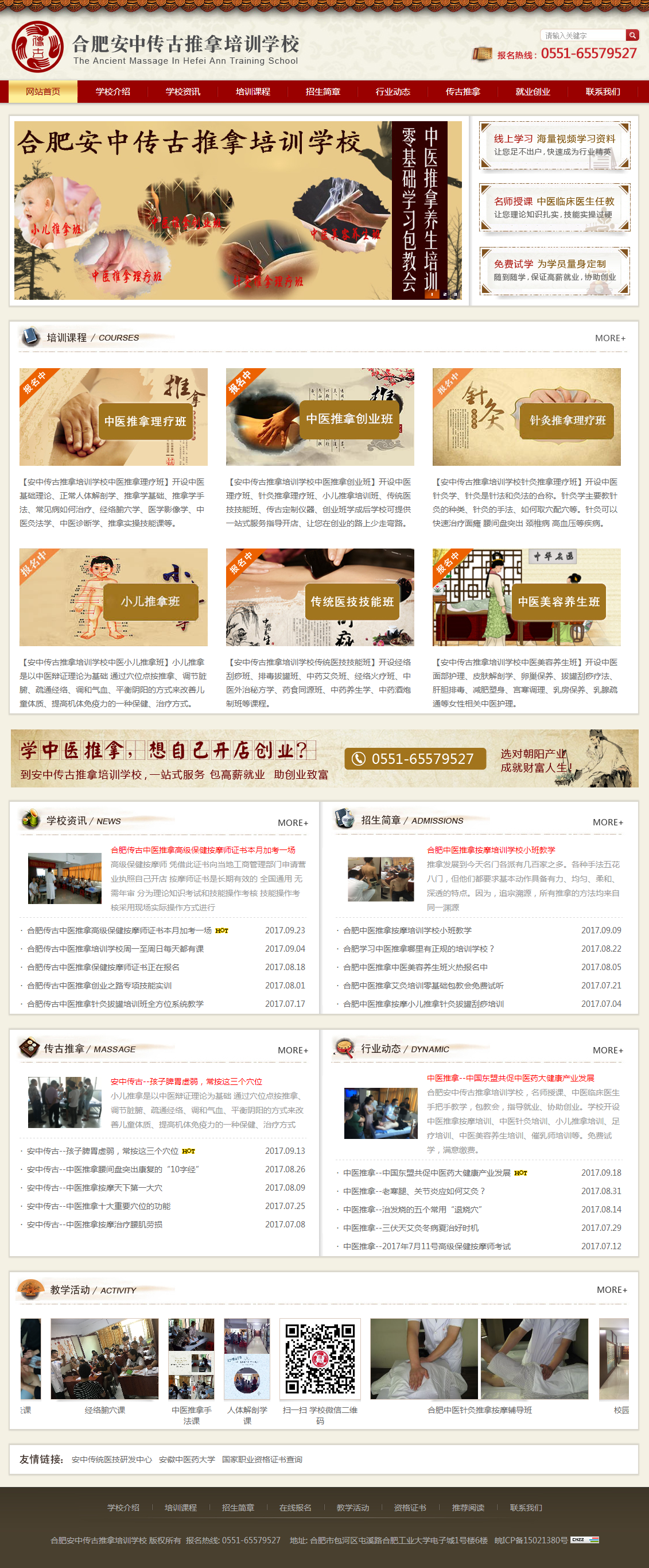 合肥安中傳古推拿培訓(xùn)學(xué)校以中醫(yī)推拿按摩培訓(xùn)為特色,專注于傳統(tǒng)醫(yī)技的研發(fā)推廣,傳統(tǒng)醫(yī)學(xué)技術(shù)(中醫(yī)推拿、艾灸、刮痧、拔罐、火療、刺血、針灸、穴位埋線、養(yǎng)生藥酒、藥食同源等)的推廣培訓(xùn),成人繼續(xù)教育考培輔導(dǎo),健康產(chǎn)品及服務(wù)的研究開發(fā)等。學(xué)校自成立以來,培養(yǎng)了一大批具有現(xiàn)代化養(yǎng)生知識和理念的專業(yè)人才,提高了保健養(yǎng)生人員的學(xué)歷層次,自主研發(fā)的“保健養(yǎng)生酒”系列、“藥食同源”保健食品系列深受廣大學(xué)員和市場的喜愛。
